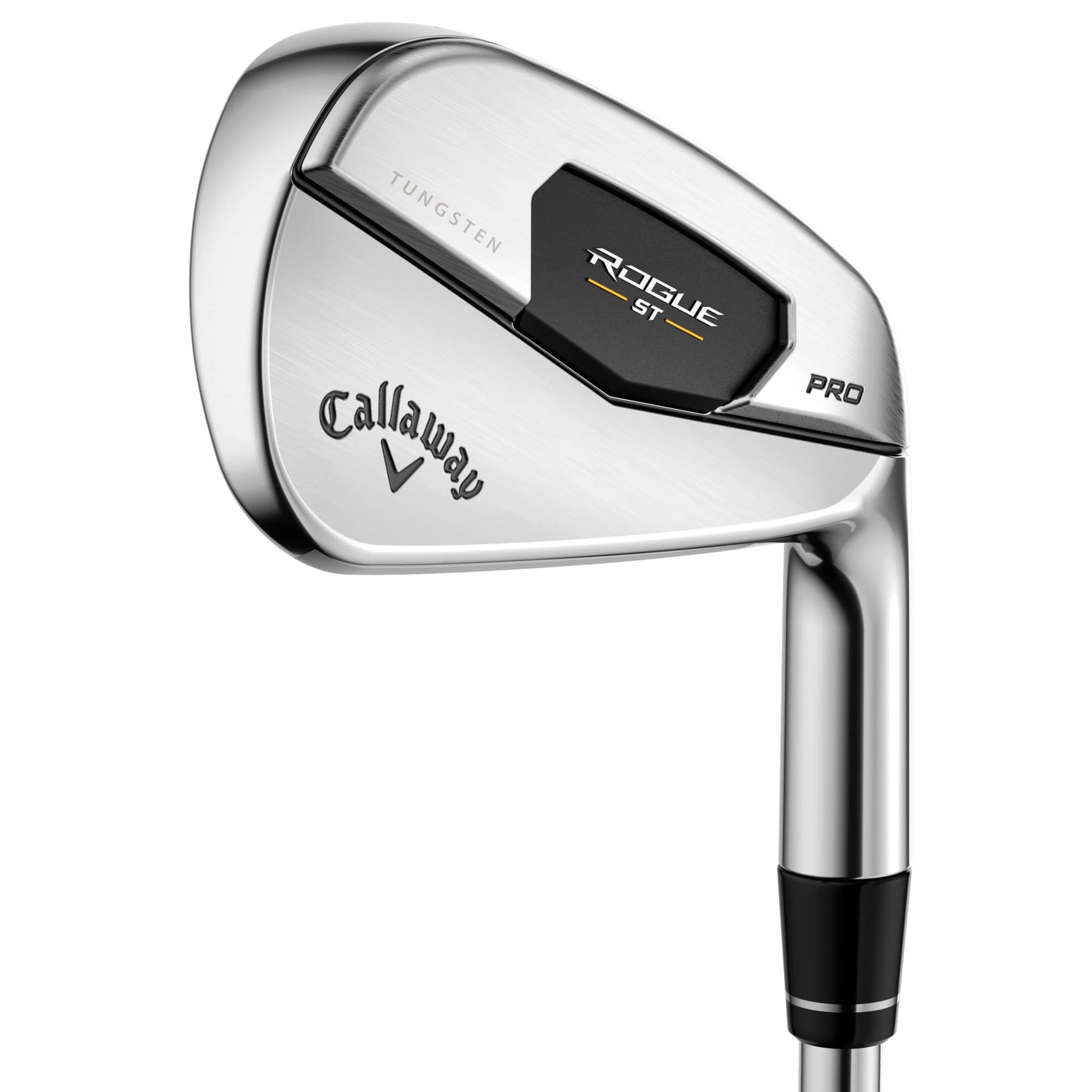 Callaway Rogue ST Pro Golf Irons The 2022 Rogue ST Pro Irons feature all of the best technologies used in the Rogue ST series, and tweaked them to create a set of Irons suitable for low-to-mid single digit handicap golfers.& The Rogue ST Pro Irons are designed using a hollow body construction to create a more compact, workable look and feel of a performance iron. But these looks have also been backed up with added distance and forgiveness like that of a game improvement iron.& Callaway have applied their A.I. Face Optimisation for the Rogue ST Pro allows for unique design for each model and loft to create a spin rate which is consistent across the entire face of the golf club. This helps to create high launch and COR, plus a more controlled landing angle to help balls played onto the green to stay there.& To go along with this, Callaway have also combined high strength 450 steel with the A.I. designed Flash Face Cup. This combination allows for the Rogue ST Pro to deliver more ball speed and better ball speed consistently. Within the club there have been two further additions to help maximise ball speed.& With the Rogue ST Pro Callaway have added their new precision tungsten weighting features, with the ability to have up to 48 grams of high-density tungsten, an increase over the MAVRIK Irons of 188%. This weight provides improved launch conditions and also maximises the speed that can be generated across the face to improve players ball speed and distance.& Callaway have also managed to push the innovations using their patented Urethane Microsphere. These microspheres have now been pushed further up the face in the Rogue Irons (up to the 6th groove of the face) to not only enhance the sound of the club connecting with the ball, but to also deliver a pure feel while maintaining fast ball speeds. This particular listing offers a Steel shaft. You may also wish to view&Rogue ST Pro Golf Irons in Graphite Callaway Rogue ST Pro Golf Irons,&Features & Technologies More Ball Speed from the all-new High Strength 450 A.I. Designed Flash Face Cup& An industry-first, we combined high strength 450 steel with our A.I. designed Flash Face Cup. This delivers more ball speed and better ball speed consistency. New A.I. Face Optimization forSpeed, Launch and Spin Callaway applied our new A.I. Face Optimization to RogueST Pro. It’s unique for each model and loft to create spin rate consistency across the face. This delivers high launch and COR and a more controlled landing angle to help hold greens. Precision Tungsten Weighting for Optimal Launch The new precision tungsten weighting features up to 48g of high-density tungsten, a 188% increase over MAVRIK. This provides improved launch conditions and also maximizes speed across the face. Patented Urethane Microspheres for Pure Feel& The patented urethane microspheres are now pushed further up the face in RogueST irons (up to the 6th groove) to enhance sound and deliver pure feel while maintaining fast ball speeds. Compact, Workable Shape& Rogue ST Pro irons are designed using hollow body construction to deliver the look and feel of a players performance iron, with the distance and forgiveness of a game improvement iron.