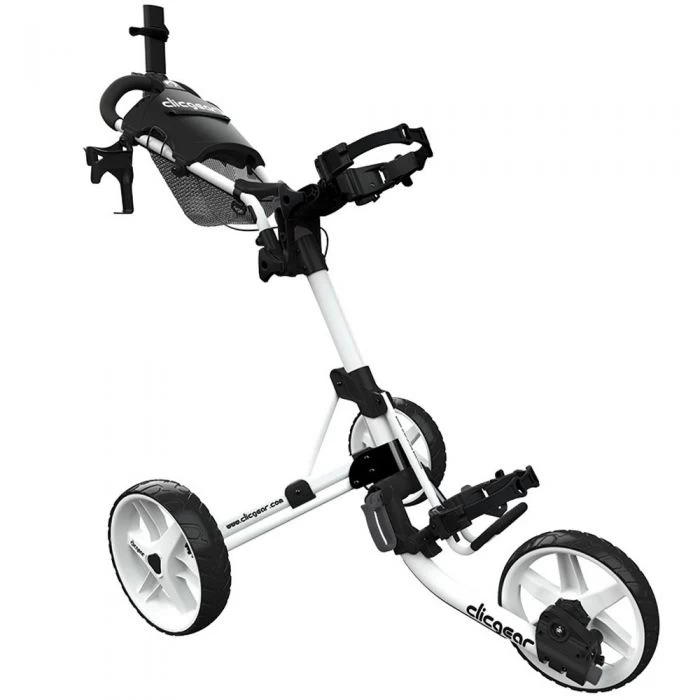 Building on the success of Clicgear’s 3-wheel golf pushcart design, the 4.0 adds several improvements to the original design to make this the most revolutionary model yet. These include New lid lock, adjustable upper saddle, silicone straps, adjustable front wheel, umbrella tube strap, improved scorecard & pencil holder.