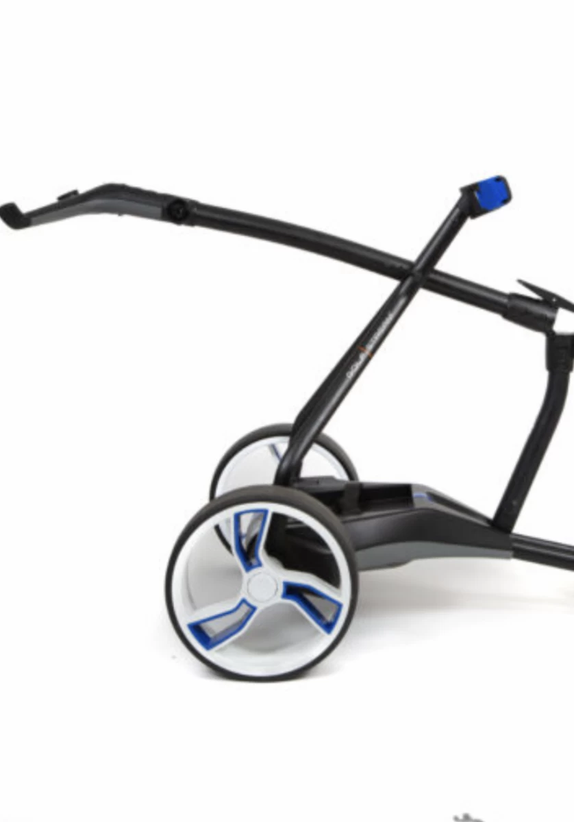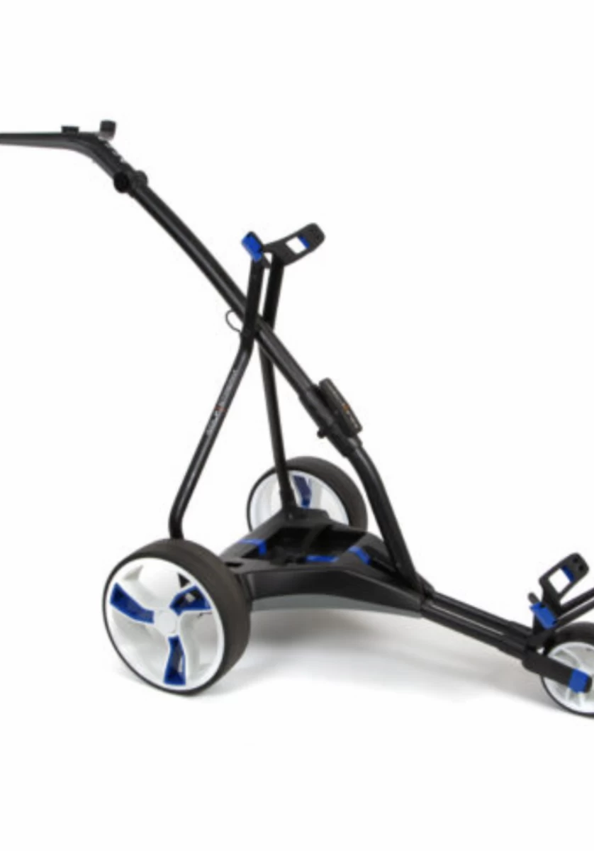 Modelled on the bestselling Golfstream vision, the blue offers the same sleek design, super easy erection and fold down but with just an indicator light to show power to the motor and a rotary dial to increase/decrease speed. In truth just like golf trolleys used to be.