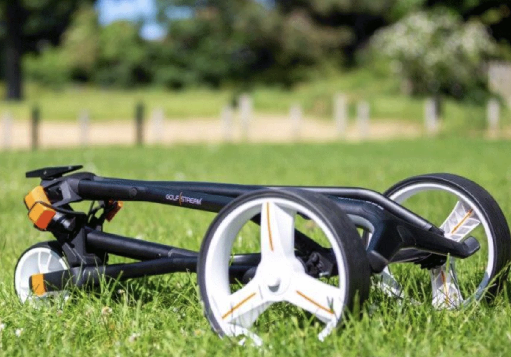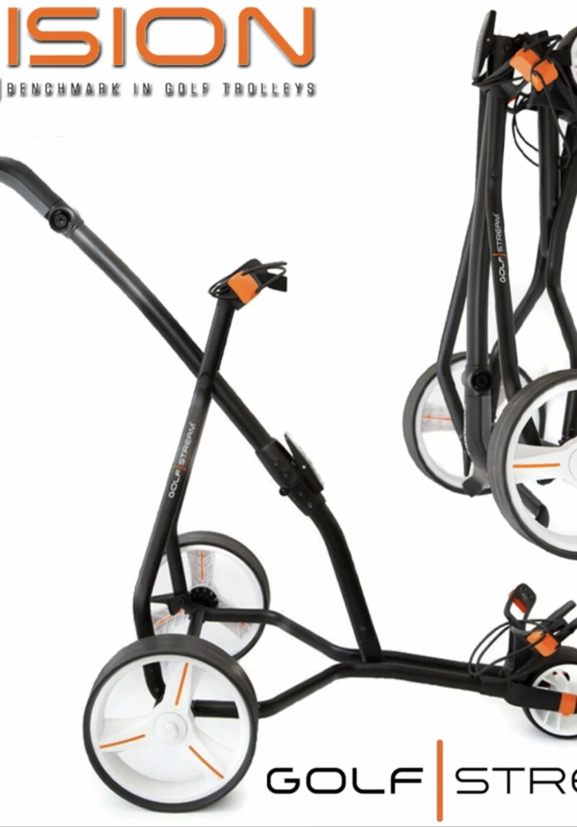 The Golfstream Vision Express Golf Push Trolley is set to take the golf market by storm based on the best selling Vision golf trolley frame the express offers lightweight performance . The highly functional express trolley folds flatter than most trolleys via a one touch super simple fold/unfold system. The ergonomic dual grip handle offers the ultimate in maneuverability and the vision trolley frame features a 2 sided accessory station which allows for an umbrella and drinks holder to be mounted simultaneously. The trolley is constructed from a lightweight powder coated aluminium frame that offers both durability and stability whilst on the course. Top and bottom bag cradles with bungee securing cods allow the express to accommodate any size of golf bag including larger tour bags. The front wheels feature housing to avoid clogging and this Golf trolley also has Super slick high grip PU rubber tyres that are durable and built to last.
