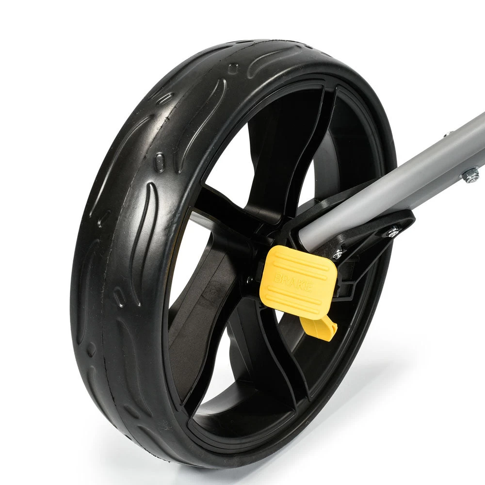 Versatile and stable, it easily handles even the hilliest of courses, with generously sized wheels that offer superb traction even in muddy ground conditions. Adjustable bag straps keep everything secure, alongside a quick action footbrake.