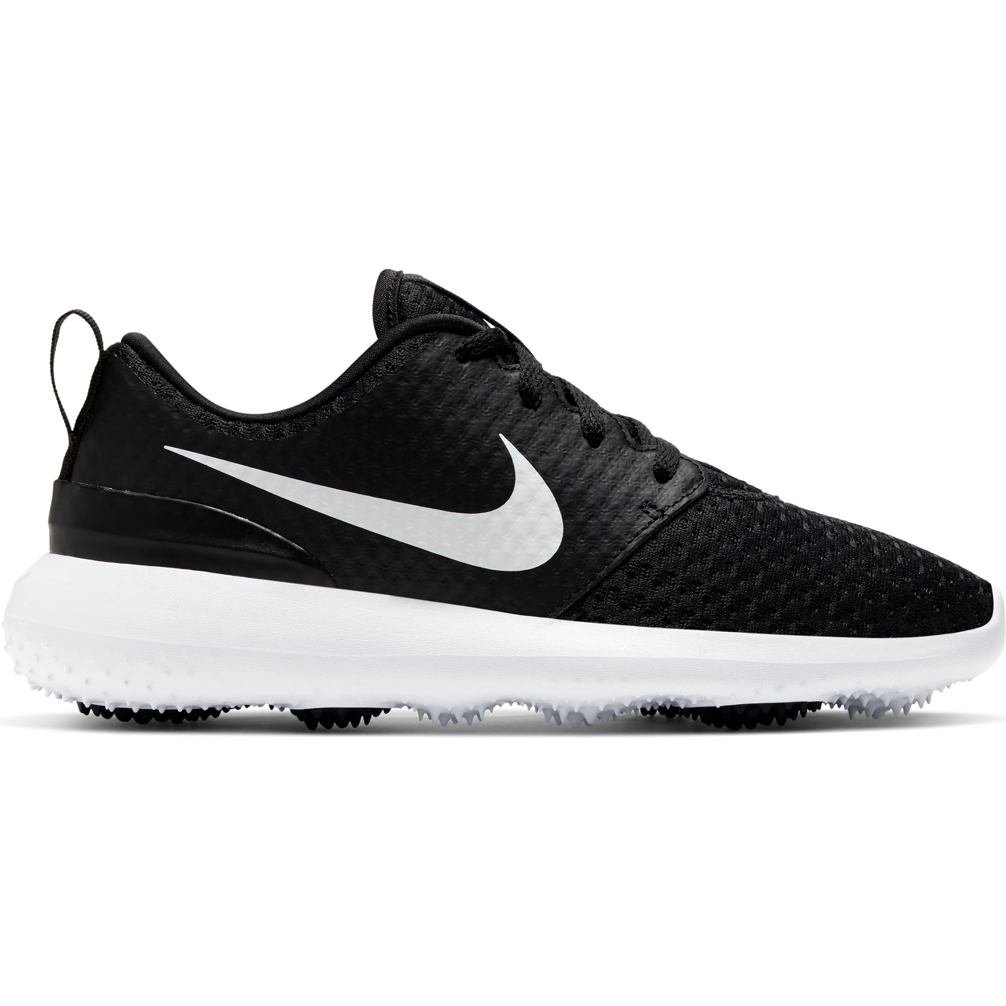 Nike Roshe G Junior Golf Shoes The Nike Roshe G Jr. features a pressure-mapped outsole that provides traction in key zones so that the junior golfer can feel in control at all times.& Inspired by the original, iconic Roshe, the mesh upper offers breathability and a modern look, while the soft, flexible, foam midsole cushions every step so that a 9 or 18 hole day is less taxing. The elastic gusset on the tongue of the shoe helps keep out debris, such as turf or sand, and the pull tabs on the heel and tongue offer easy on and off action for the end of the day. Benefits Pressure-mapped outsole provides traction in key zones. Iconic mesh upper delivers breathability and style. Injected midsole delivers soft, lightweight cushioning. Elastic gusset on the tongue helps keep out debris. Pull tabs on the heel and tongue offer easy on and off. Cupsole-like design offers flexible, low-profile support and a stable feel. Shown: Black/White/Metallic White Style: 909250-007