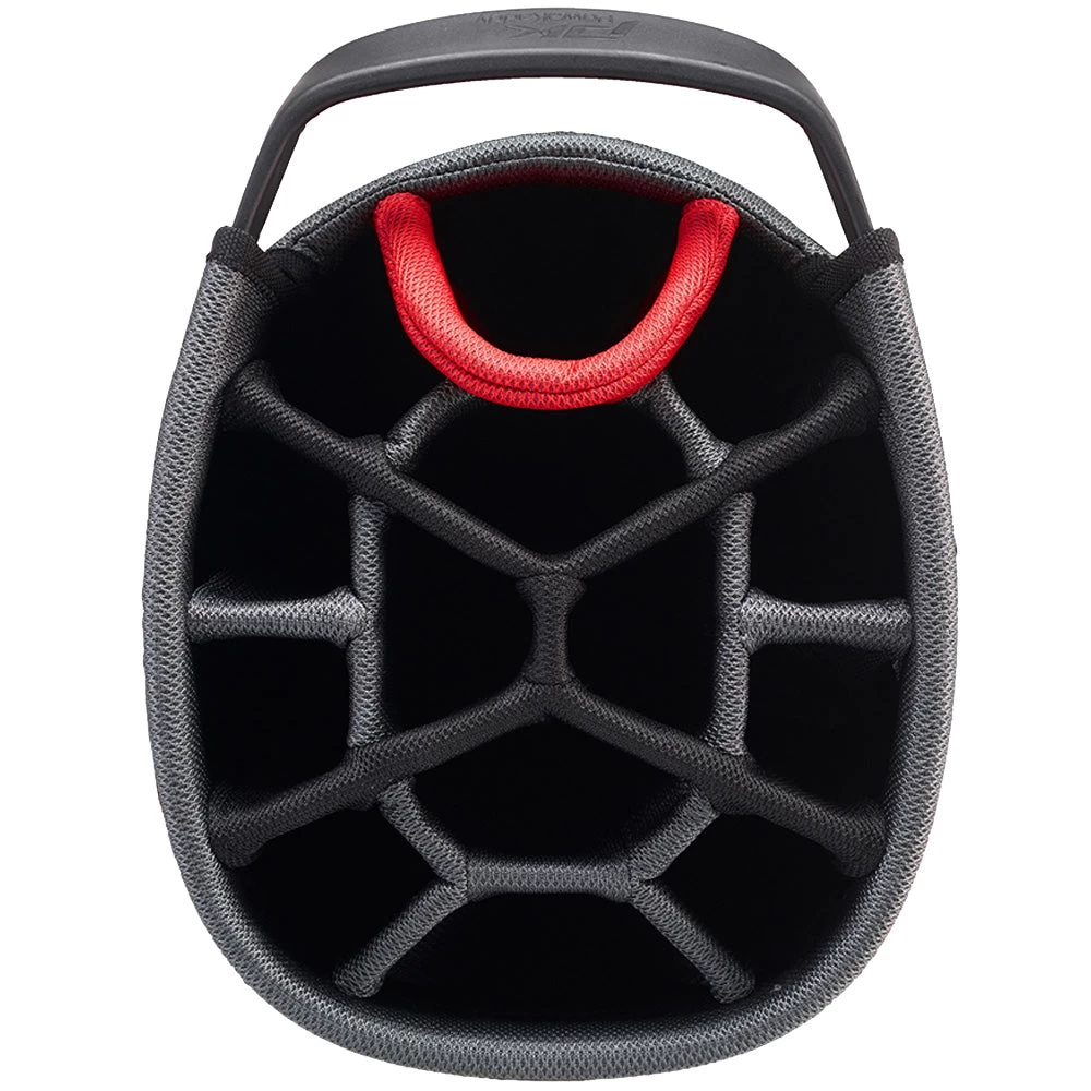 13 pockets in total including, a velour lined water-resistant valuables pocket, insulated cooler pocket, 2 large full length apparel pockets, accessory pocket, a large golf ball pocket, and a small tees pocket. Alongside these pockets there is a towel holder, a scorecard holder, a pencil holder and an internal umbrella bay with a plethora of storage options this cart bag is a great option for any golfer.