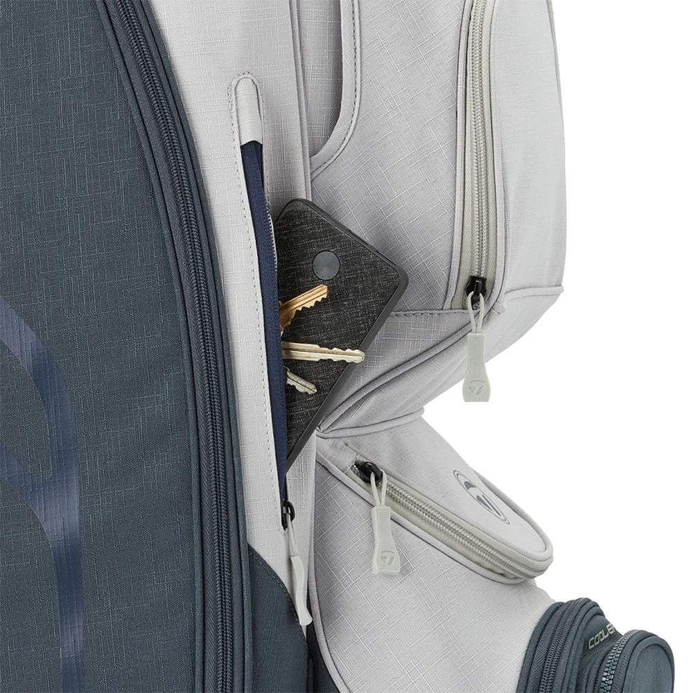 The 14-way divided top offers plenty of room for club organisation, complete with rain hood to protect clubs in adverse weather conditions. 9 total pockets offer room for accessories, valuables, garments and more, all of which are easily accessible while the bag is cart mounted.